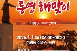 통영시는 2026 병오년(丙午年) 붉은 말의 해를 맞아 2026년 1월 1일(목) 오전 6시부터 정량동 이순신공원에서 새해 해맞이 행사를 개최한다. 이번 행사는 2026년 새해를 맞아 희망찬 새 출발을 다짐하고, 시민과 함께 미래 100년의 도시 통영을 기원하기 위해 마련됐다. 이번 행사에서는 ▴소원 기원초 밝히기 ▴성악가 신문희(‘아름다운 나라’원곡자)와 통영여성 합창단 공연 ▴퓨전국악 공연 ▴신년 축하 메시지 전달 ▴신년 떡 절단 등 다채로운 프로그램으로 진행될 예정이다. 또한 시민 참여형 부대행사로 새해 소망지 쓰기와 포토존을 운영하고, NH농협 통영시지부에서는 민간 자체 참여 프로그램으로 해맞이 행사에 참여한 시민과 관광객에게 따뜻한 어묵과 떡을 제공할 계획이다. 이번 행사는 시민과 관광객 누구나 참여할 수 있으며, 정량동 이순신 공원은 한산대첩 승전 해역인 견내량과 한산도 제승당을 한눈에 조망할 수 있는 통영의 대표적인 해맞이 명소로 잘 알려져 있다. 시는 유관기관 및 단체와의 긴밀한 협조체계를 통해 행사 안전과 시민 편의를 철저히 확보하고, 새해 첫날 이순신공원을 찾는 시민들에게 뜻깊은 추억과 감동을 선사할 계획이다. 아울러 개인 텀블러 지참을 통