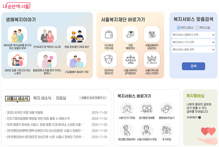 메인 페이지와 메뉴는 시민이 원하는 복지 정보를 직관적으로 찾을 수 있도록 전면 재구성했다. 메인 페이지 중앙에는 ‘서울복지재단 바로가기’ 메뉴를 새롭게 추가했으며, 복지재단의 ‘꿈나래 통장’, ‘청년부상 제대군인 지원’ 등 6종 복지서비스 안내와 함께 온라인 신청과 상담도 연계했다.