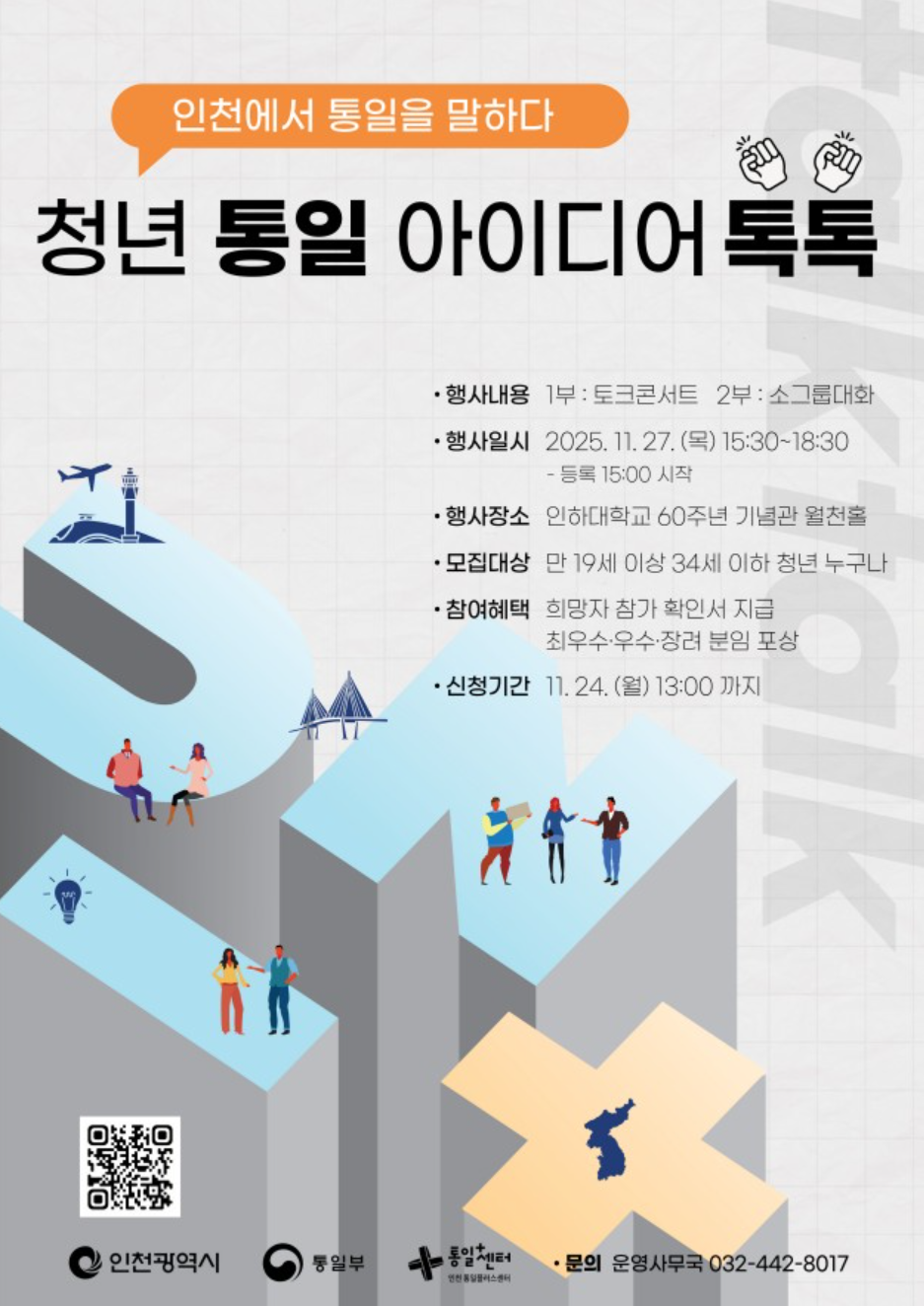 오는 11월 27일 인하대학교 60주년기념관에서 청년 사회적 대화 프로그램 ‘청년 통일 아이디어 톡톡’이 개최된다. 인천통일플러스센터에서 진행하는 이번 행사는 만 19~34세의 청년이라면 누구나 참가할 수 있다.