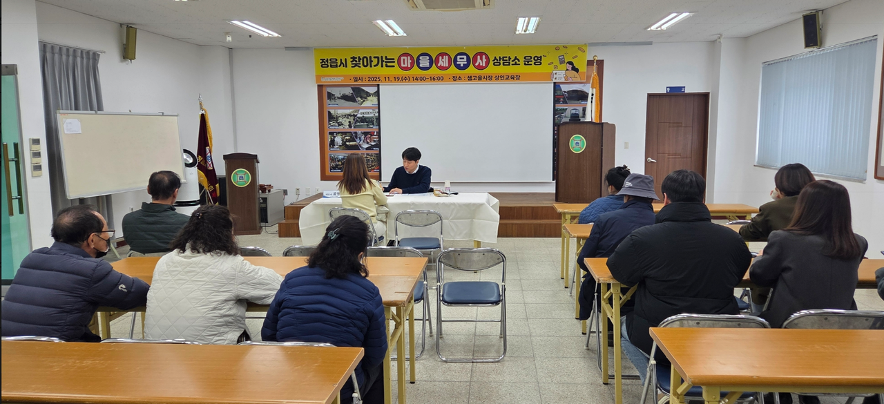 시는 19일 샘고을시장 상인교육장에서 ‘찾아가는 마을세무사 상담소’를 운영하고, 상인들의 눈높이에 맞춘 실무 중심의 세무 상담 서비스를 제공했다.