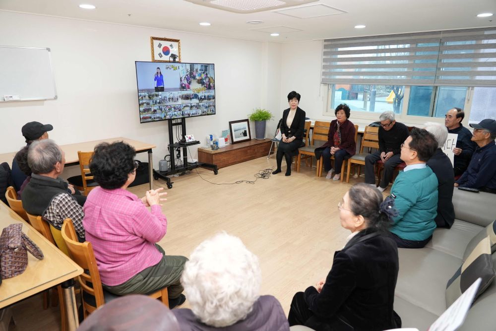 춘천시는 지난달부터 30곳의 스마트경로당을 동시에 연결해 화상 노래교실을 운영하고 있다. 육동한 시장은 19일 모아엘가센텀뷰 경로당을 방문해 프로그램을 직접 참관하며 어르신들과 소통했다. 육 시장은 화면에 연결된 다른 경로당을 호명하며 인사를 나누고 ‘모정의 세월’을 부르기도 했다.