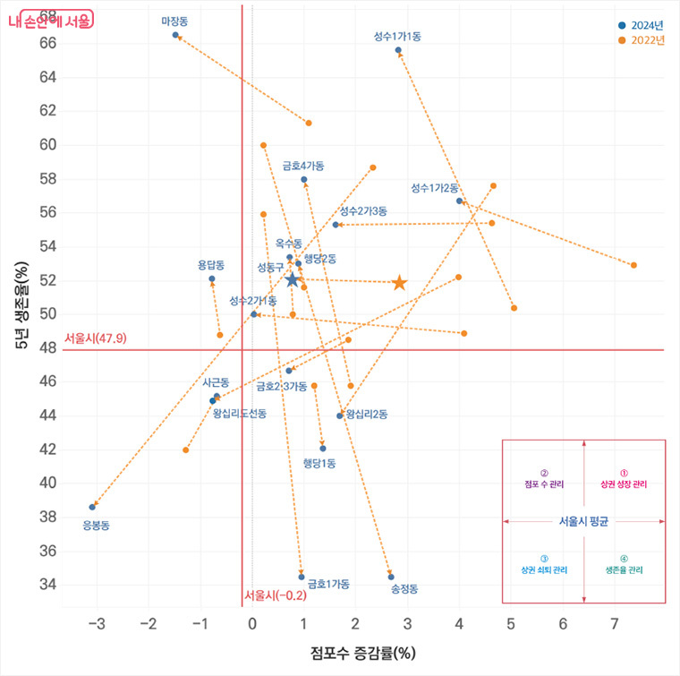 상권의 안정성을 가늠할 수 있는 핵심 지표인 ‘생존율’은 전년 대비 증감률을 함께 제시해 각 자치구의 상권 유지력과 회복력을 객관적으로 비교할 수 있도록 했다.