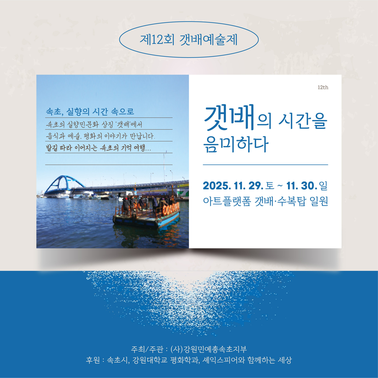 속초의 실향민문화를 상징하는 갯배 일원에서 지역의 음식과 예술, 이주민의 삶을 함께 체험하는 축제가 열린다. 속초민예총은 오는 11월 29일부터 이틀간 아트플랫폼 갯배 일원에서 제12회 갯배예술제를 개최한다. 올해 슬로건은 갯배의 시간을 음미하다로, 속초의 정체성과 실향의 기억을 지역 예술과 미식문화로 풀어내는 자리다.