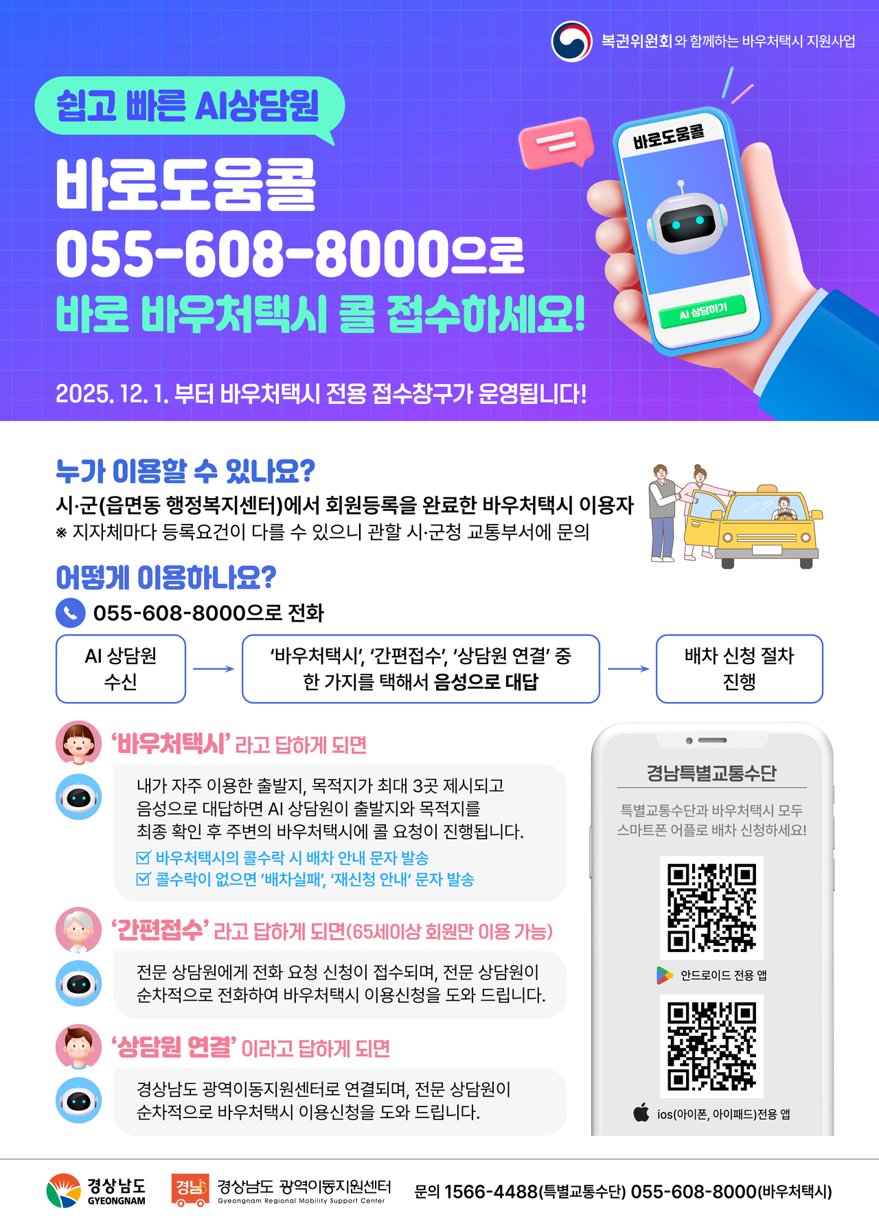 경남도는 다음 달 1일부터 인공지능(AI) 기반 바우처택시* 전용 배차시스템인 ‘바로도움콜’을 시범 운영한다고 27일 밝혔다.