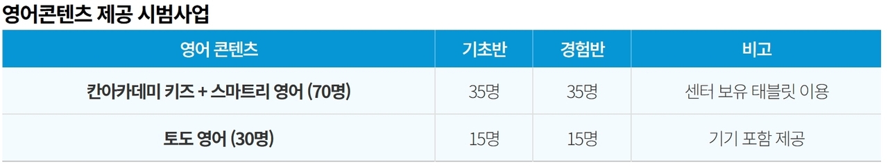 영어 경험 유무에 따라 기초반, 경험반 각 50명을 모집하며 모집인원을 초과한 경우 센터별 추천 인원과 취약계층 아동 비율 등을 종합적으로 고려해 대상자를 선정하고 12월 5일 최종 결과를 발표할 예정이다.