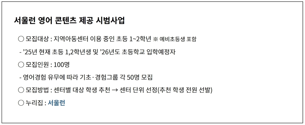 ‘서울형 영어교육’ 참여를 원하는 지역아동센터는 11월 28일부터 12월 4일까지 센터별 추천 아동 명단을 취합해 대표 이메일로 접수하면 된다. 대상은 센터를 이용 중인 2025년 현재 초등 1~2학년 및 2026학년도 입학 예정 아동 총 100명이다.