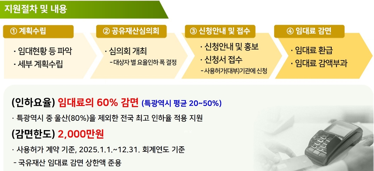 대전시 공유재산은 1,150개 업체와 개인이 임대해 사용 중이다. 연간 약 105억 원의 임대료를 납부하고 있으며 이중 소상공인 등 영세업체가 점포수의 97.7%, 임대료 87.4%를 차지한다. 소상공인과 중소기업을 대상으로 2025. 1. 1. ~ 12. 31(1년)이며, 이미 납부한 임대료는 소급 적용이 가능하다.