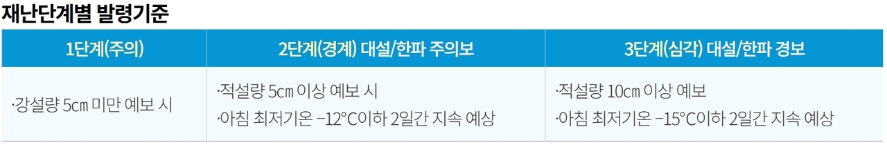 관심–주의–경계–심각 단계에 따른 재난 상황관리를 강화하기 위해 본부와 25개 소방서에 비상상황실을 운영하고, 한랭질환자 조기 발견과 신속한 응급처치를 위해 쪽방촌 등 주거 취약지역을 중심으로 예방순찰을 강화한다.