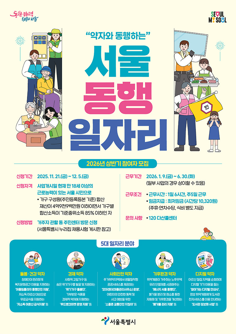 내년 상반기 ‘서울 동행일자리’ 사업은 2026년 1월 9일부터 6월 30일까지 운영되며, 사회안전·돌봄건강·디지털·기후환경·경제 등 5개 분야 729개 사업(시·구 합산) 현장에서 총 6,598명이 활동할 계획이다.