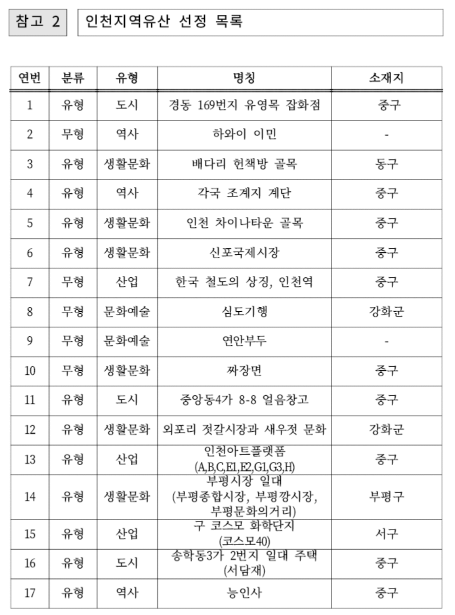 이번에 선정된 ‘인천지역유산’은 배다리 헌책방 골목, 각국 조계지 계단, 신포국제시장, 짜장면, 인천아트플랫폼 등 총 17건이다. 개항의 역사와 생활사, 산업・도시 변화의 흐름을 보여주는 기록과 공동체의 기억이 축적된 공간 등이 포함돼 시민 공감도를 높였다는 평가를 받고 있다.