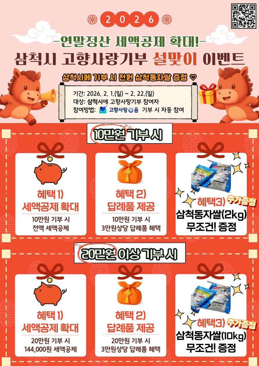 삼척시는 2026년 고향사랑기부제 세액공제 혜택 확대를 기념해 설 명절을 맞아 「삼척시 고향사랑기부제 설맞이 이벤트」를 진행한다.