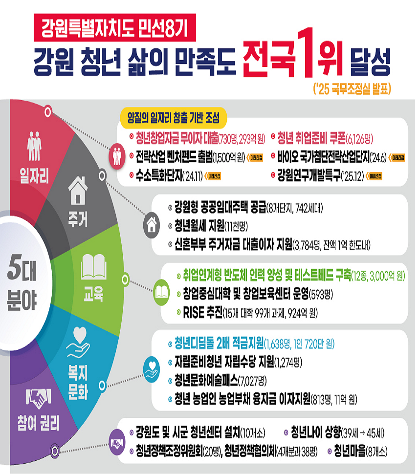 셋째,「교육-일자리 연계 강화」분야는 25개 사업에 8,303억 원을 투입한다. ▲강원형 반도체산업 인력육성, ▲디지털헬스케어 AI융합혁신 허브 조성(신규), ▲지역혁신중심 대학지원체계(RISE), ▲청년재테크스쿨 운영(신규), ▲글로컬대학 지원 등을 통해 지역 핵심인재를 양성하고 산업 수요에 대응한다.