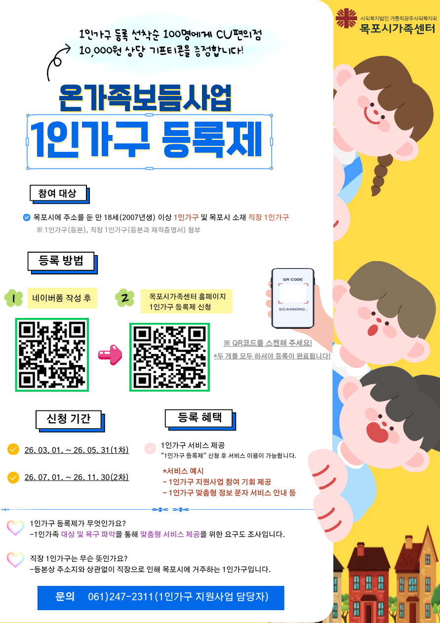 목포시는 최근 1인가구 비율 증가에 대응해 혼자 생활하는 시민을 보다 체계적으로 지원하기 위해 ‘1인가구 등록제’를 도입하고, 오는 3월부터 목포시가족센터(센터장 최성숙 요셉피나 수녀)에서 접수를 시작한다.