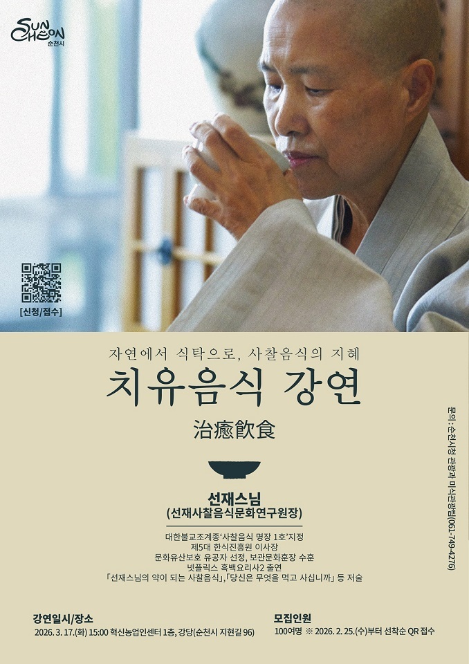 시는 오는 3월 17일, 사찰음식 명장 제1호인 선재스님을 초청해 ‘자연에서 식탁으로, 사찰음식의 지혜’를 주제로 강연을 진행한다. 이번 강연은 사찰음식이 지닌 치유의 의미와 제철 식재료의 생명력, 그리고 음식을 통해 몸과 마음을 다스리는 철학을 중심으로 구성될 예정이다.