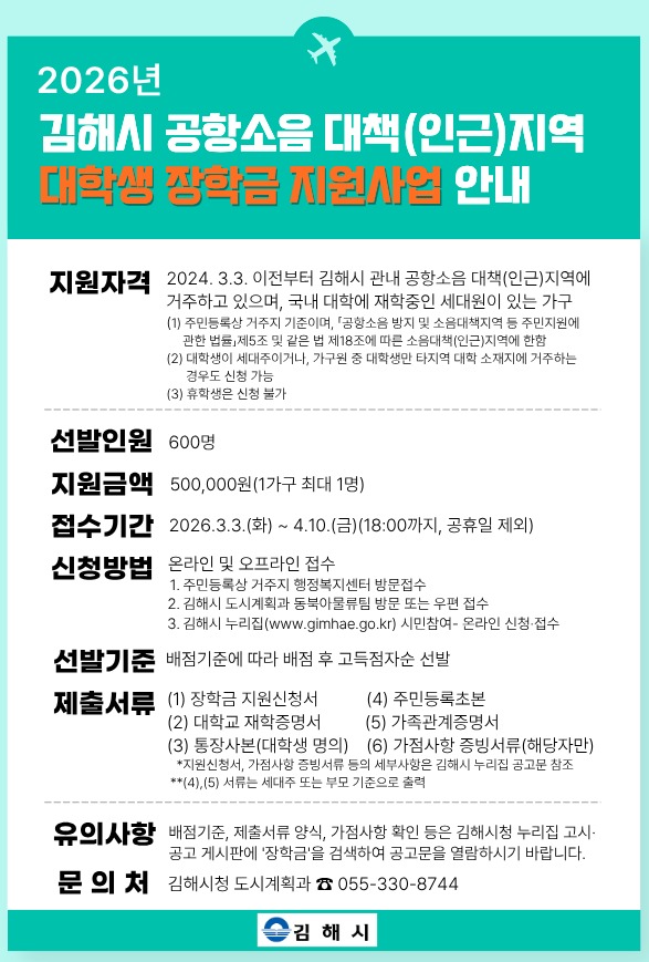 김해시는 김해공항 소음대책(인근)지역 대학생을 대상 장학금 지원사업을 확대 시행한다고 밝혔다.