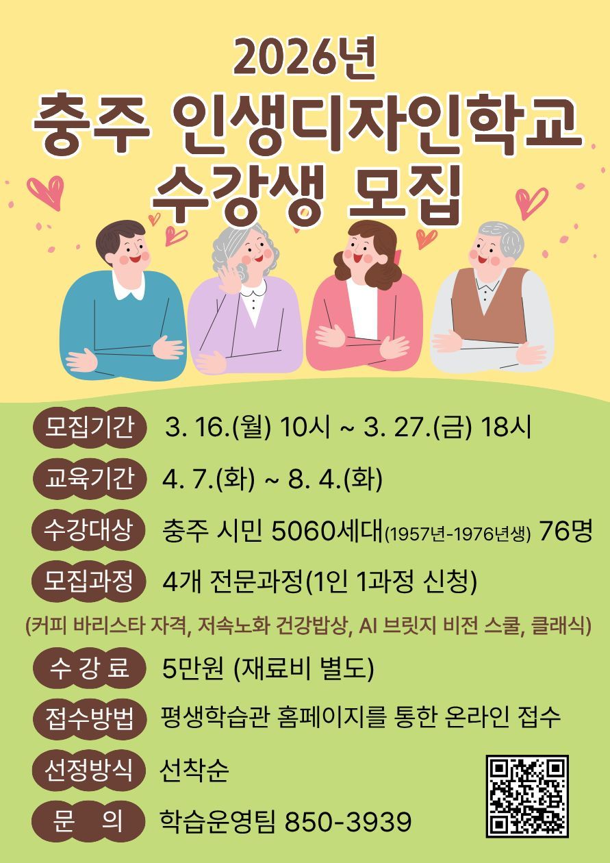충주시 평생학습관이 5060세대 시민의 인생 2막 설계를 지원하기 위해 ‘2026년 충주 인생디자인학교’ 수강생을 모집한다고 밝혔다.