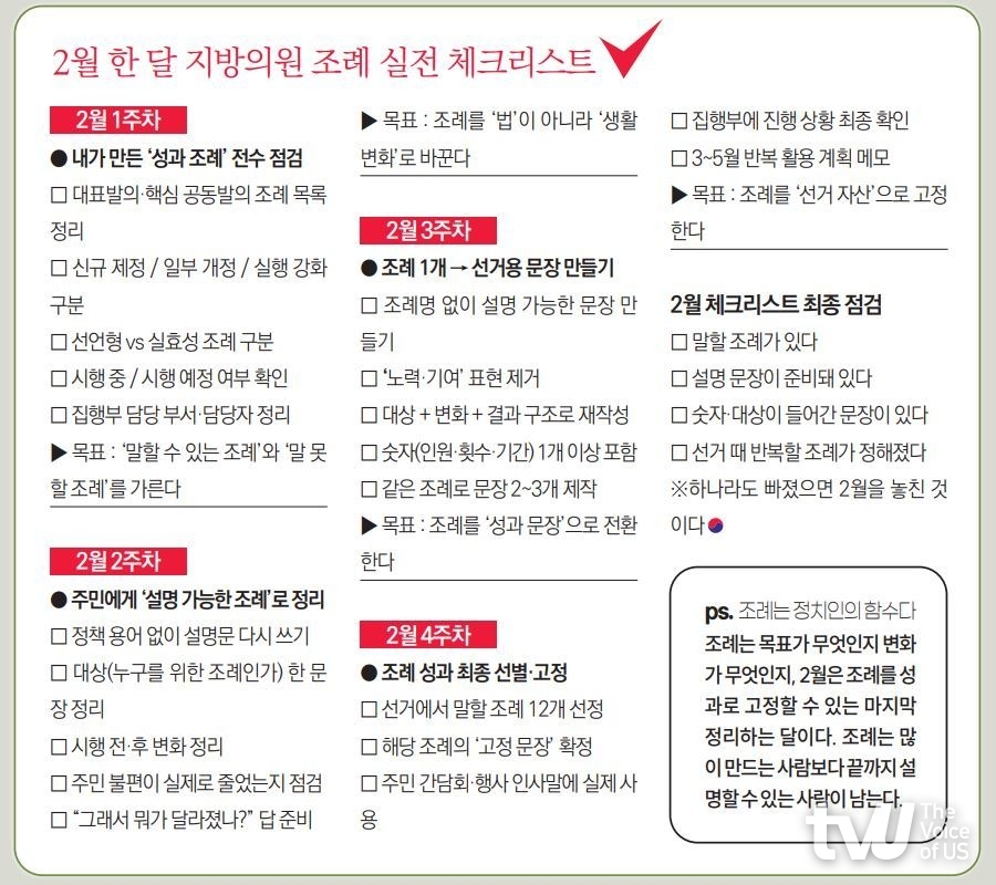 2월은 조례를 ‘설명’하고 ‘정리’해 선거에서 꺼낼 수 있는 형태로 바꾸는 달이다.