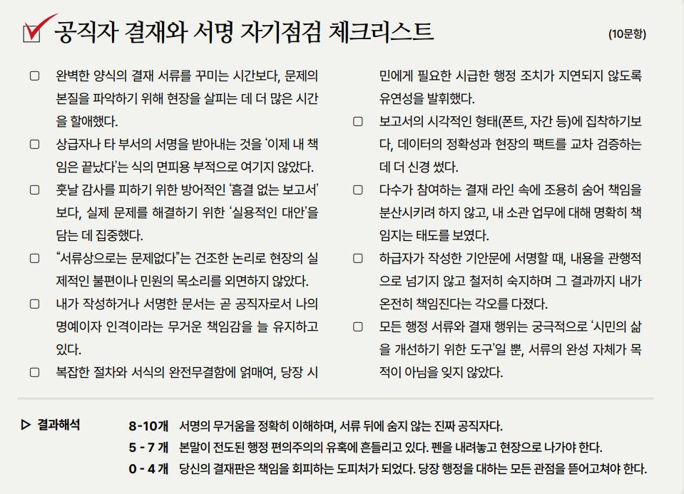 결재판에 서명하는 순간, 공직자는 스스로에게 물어야 한다. ‘나는 지금 이 사안의 무게를 책임지기 위해 펜을 들었는가, 아니면 책임을 면하기 위해 펜을 들었는가.’ 그것은 오롯이 당신이 그 자리에 존재해야만 하는 이유를 증명하는 가장 무거운 기록이다.