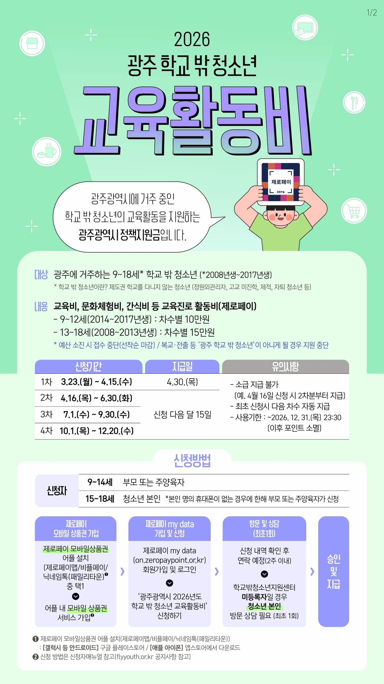 신청을 희망하는 청소년은 오는 23일부터 ‘광주광역시학교밖청소년지원센터 누리집’(www.flyyouth.or.kr)과 ‘제로페이 마이데이터 누리집(on.zeropaypoint.or.kr)’을 통해 온라인으로 접수하면 된다. 시·구 학교밖청소년지원센터는 신청자의 거주지와 자격 요건 등을 확인 후 최종 승인하며, 승인된 대상자에게는 해당 분기의 포인트가 지급된다.