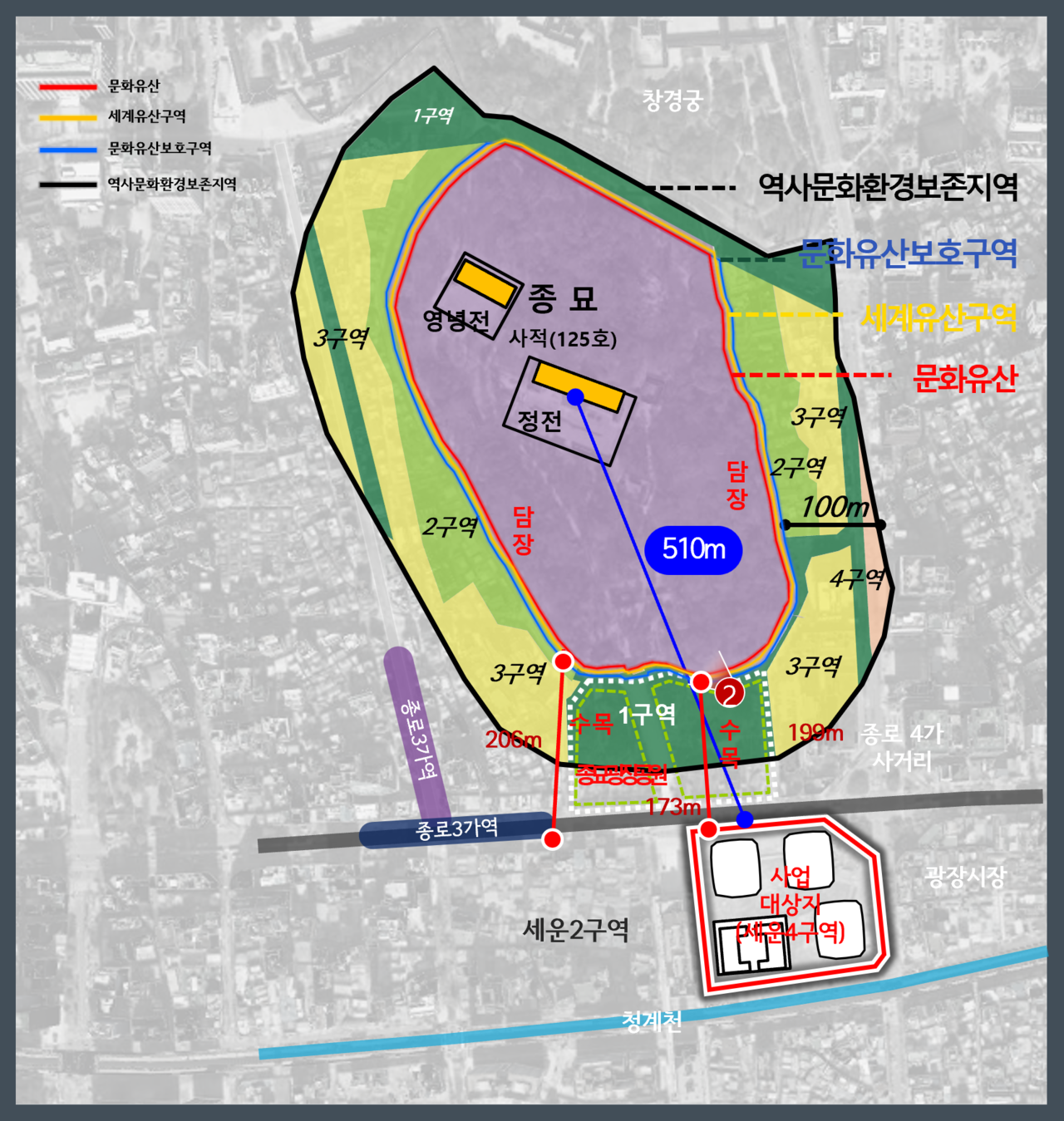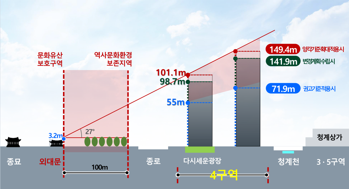 세운지구 개발, 그중에서도 세운4구역의 추진을 가로막았던 핵심 요인은 법적 규제 대상이 아님에도 불구하고 겪어야 했던 행정적 불확실성이었다. 세운4구역은 국가유산 보호구역 경계로부터 100m 밖에 위치하여 본래 법적 규제 범위에 해당하지 않으나, 오랫동안 불필요한 높이 조정 등을 겪으며 사업 동력이 크게 위축되어 왔다.