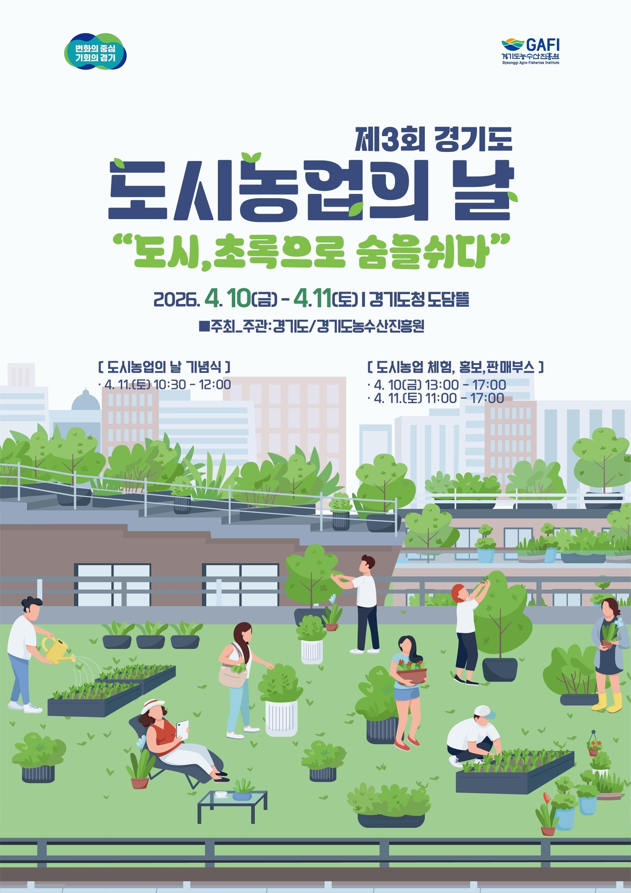 경기도가 주최하고 경기도농수산진흥원이 주관하는 이번 행사는 ‘도시, 초록으로 숨을 쉬다’라는 부제로 무너진 도심 생태계를 복원하고 시민의 마음을 치유하는 도시농업의 가치를 조명한다.