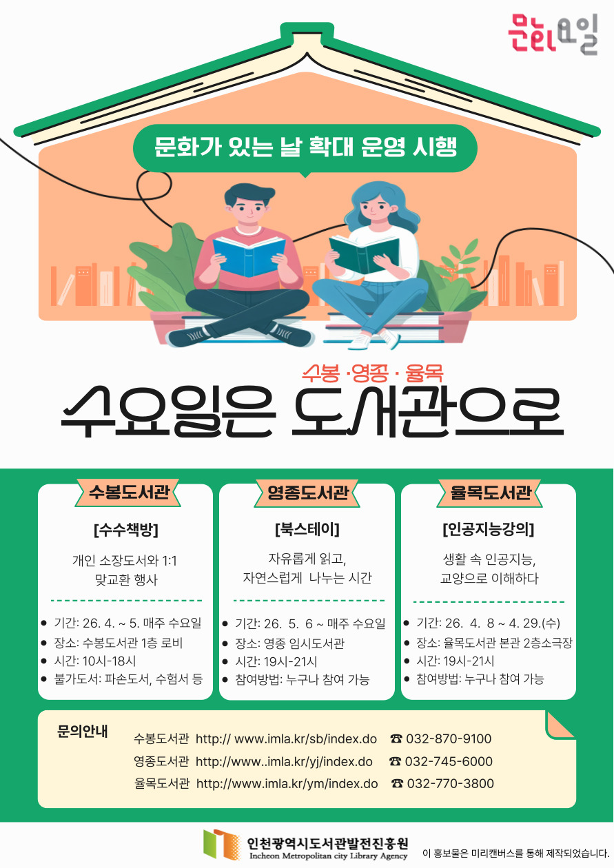 인천광역시는 매월 마지막 주 수요일에 운영하던 ‘문화가 있는 날’을 오는 4월부터 ‘매주 수요일’로 전격 확대한다고 밝혔다. 대상은 관내 수봉·영종·율목도서관 3개소다.