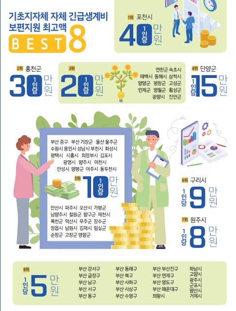 기초지자체로는 경기도 31개 시·군과 부산광역시 16개 구·군, 강원도 18개 시·군, 전라북도 12개 시·군이 1인당 적게는 5만 원~많게는 40만 원까지 보편적 긴급재난지원금을 지원했다