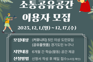 경기도여성비전센터가 오는 12월 1일부터 2026년도 상반기 ‘소통공유공간’ 이용을 희망하는 정기 모임과 단체 20곳을 모집한다. ‘소통공유공간’은 캘리그라피, 글쓰기, 서예, 댄스, 악기연주 등 다양한 활동이 가능한 5개의 ‘커뮤니티 공간’과 영상 제작·편집, 온라인 회의, 업무 등이 가능한 4개의 ‘공유 플랫폼’으로 구성돼 있다. 경기도여성비전센터는 모임 활동의 안정적 운영을 지원하기 위해 2021년부터 커뮤니티 공간의 정기 이용자를 모집해 왔다. 올해 하반기 정기 모집부터는 공유 플랫폼까지 대상을 확대해 총 9개의 공간을 제공하며, 정기 이용 외 수시 예약도 가능하다. ‘공유 플랫폼’은 모임 제한 없이 경기도민이라면 누구나 정기 이용을 신청할 수 있으며, ‘커뮤니티 공간’은 5인 이상의 도민이 자발적으로 구성해 주 1회 이상 정기적으로 활동하는 모임이어야 한다. 이 밖의 정치·종교·영리 목적의 단체는 신청 대상에서 제외된다. 모집 기간은 12월 1일부터 12월 17일까지다. 신청에 필요한 서류는 경기도여성비전센터 누리집(gg.go.kr/woman) 공지사항에서 내려받을 수 있으며, 작성 후 담당자 전자우편(jihohope@gg.go.kr)으로 제출하면