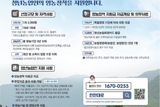 충북 괴산군은 청년농업인 영농정착지원사업 대상자를 모집한다고 11일 밝혔다. 사업은 만 18세 이상 만 40세 미만의 청년 중 영농 경력이 없거나 3년 이하인 사람을 대상으로 하며, 신청은 오는 12월 11일까지 농림사업정보시스템(agrix)을 통해 접수받는다. 대상자는 서면평가와 면접평가를 통해 선발하며, 최종 선정된 청년농업인에게는 독립 경영 연차에 따라 최장 3년간 매월 최대 110만 원의 영농정착 지원금이 지급된다. 또한, 추가 신청을 통해 농지 구입, 농업용 시설 설치, 축사부지 마련 등을 위한 창업자금으로 최대 5억 원까지 융자 지원도 가능하다. 자세한 사항은 괴산군 농업기술센터 인력육성팀으로 문의하면 된다. 송인헌 군수는 “이번 사업은 급변하는 농업환경에 대응할 수 있는 청년농업인을 적극 발굴·육성하기 위한 것”이라며 “영농에 대한 의지와 열정을 가진 청년들이 많이 참여해 지역 농업에 활력을 더하길 바란다”고 말했다.