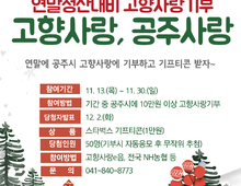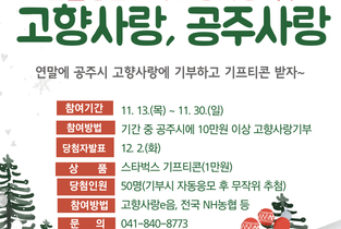 공주시는 연말을 맞아 고향사랑기부제 활성화를 위해 ‘연말정산 대비 고향사랑, 공주사랑’ 이벤트를 실시한다고 14일 밝혔다. 이번 이벤트는 11월 13일부터 30일까지 18일간 진행되며, 온라인 ‘고향사랑이음’ 또는 오프라인 전국 농협을 통해 공주시에 10만 원 이상 기부하면 자동으로 참여된다. 참여자 중 무작위 추첨을 통해 50명에게 1만 원 상당의 기프티콘(스타벅스)을 제공한다. 당첨자는 12월 2일 공주시청 누리집에 공지되며, 개별 연락도 함께 진행될 예정이다. 고향사랑기부제는 모아진 기부금을 주민 복리 증진을 위해 사용하고, 기부액의 30% 한도 내에서 답례품을 제공해 지역경제 활성화에도 기여하는 제도다. 현재 공주시는 모금액을 활용해 ▲취약계층 아동 영구치 치료 지원사업 ▲고향에 계신 어르신 이불빨래 대행사업 등을 추진하고 있다. 최원철 시장은 “이번 이벤트를 통해 고향사랑기부제의 취지를 널리 알리고 더 많은 시민의 참여를 이끌어낼 계획”이라며 “연말을 맞아 기부자분께 감사의 마음을 전하는 행사인 만큼, 아직 참여하지 못한 분들의 많은 관심과 참여를 부탁드린다”고 말했다. ※ 문의처 : 인구정책과 고향사랑팀 (☏041-840-8773) / 강선영-