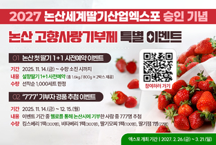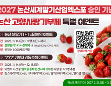 지금 논산시 고향사랑기부제에 참여하면 설향 딸기 1+1 혜택을 받을 수 있다. 논산시는 2027년 논산세계딸기산업엑스포 승인을 기념해 고향사랑기부제 특별 행사 ‘Very Berry Good’을 민간 플랫폼 웰로(Wello) 단독으로 진행한다고 밝혔다. 이번 행사는 지역 대표 농특산물인 딸기를 주제로, 논산시를 선택한 기부자에게 풍성한 혜택을 제공하고, 지역 농가의 판로를 확대하는 동시에 2027 논산세계딸기산업엑스포의 국제행사 공식 승인을 기념하기 위해 마련됐다. 고향사랑기부제 민간 플랫폼 웰로(Wello)에서 논산 설향 딸기 800g 답례품을 선택할 경우, 선착순 1,000세트에 한해 1.6kg로 1+1 혜택이 제공된다. 사전 예약은 11월 14일(금)부터 시작되며, 주문된 딸기는 12월 초부터 신선하게 순차적으로 발송될 예정이다. 또한, 기부자 전원을 대상으로 한 ‘777 경품 추첨 이벤트’도 함께 진행한다. 11월 14일부터 오는 12월 15일까지 웰로를 통해 고향사랑기부제에 참여한 논산시 기부자 중 777명을 추첨해 △킹스베리 1팩(300명) △비타베리 1팩(300명) △딸기찹쌀떡 1팩(100명) △딸기잼 1병(77명) 등 논산을 대표하는 다양한 딸기
