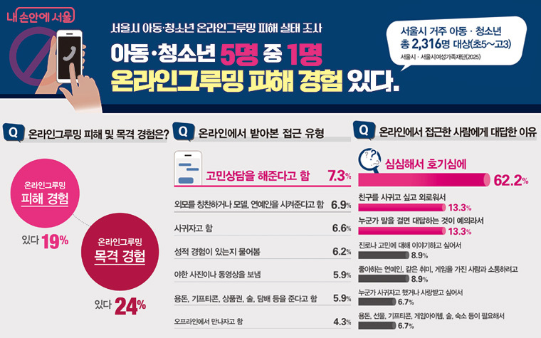 서울시가 서울시여성가족재단에 의뢰해 실시한 온라인 그루밍 피해 실태조사(서울시내 초등학교 5학년~고등학교 3학년 총 2,316명 대상, 2025년)에 따르면, 온라인 그루밍 접근을 경험한 아동·청소년은 5명 중 1명꼴(19%)로 나타났다.