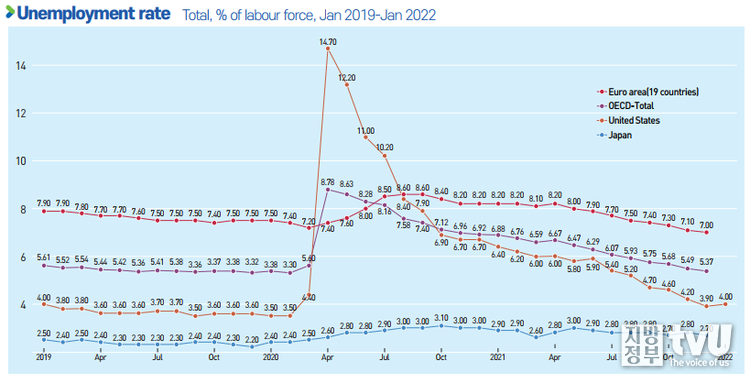 OECD의 최근 발표에 따르면 2021년 11월 5.5%이던 실업률은 12월에 5.4%로 떨어져 코로나19가 세계적으로 확산하던 2020년 2월 이전 수준으로 0.1%포인트 차이로 거의 회복된 것으로 나타났다.