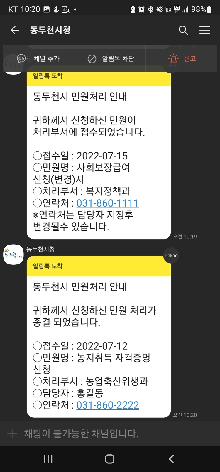 동두천시는 전국 최초로 '인공지능형 알림톡'을 자체 개발하여 오는 7월 15일부터 시행·운영한다. '인공지능형 알림톡'은 민원 빅데이터를 이용하여 미지정된 민원 처리의 담당자를 유추할 수 있는 인공지능형 시스템과 시청 조직도 시스템을 연동하여 민원처리 담당자와 팀장을 추출하여 민원 신속 처리를 유도한다. 또한, 민원 신청인에게는 접수상황과 민원처리 종결시 결과를 알려주는 서비스를 함께 운영한다. 동두천시는 '인공지능형 알림톡' 운영으로 매월 1건에서 많게는 6건까지 발생하는 지연 처리를 '제로화'하여 민원처리 단축율 향상에 기여할 것으로 기대하고 있다. 이 서비스를 개발한 황수연 팀장을 만나 타 지자체에서 도입시 어떤 점을 유의해야 할지 알아보자.