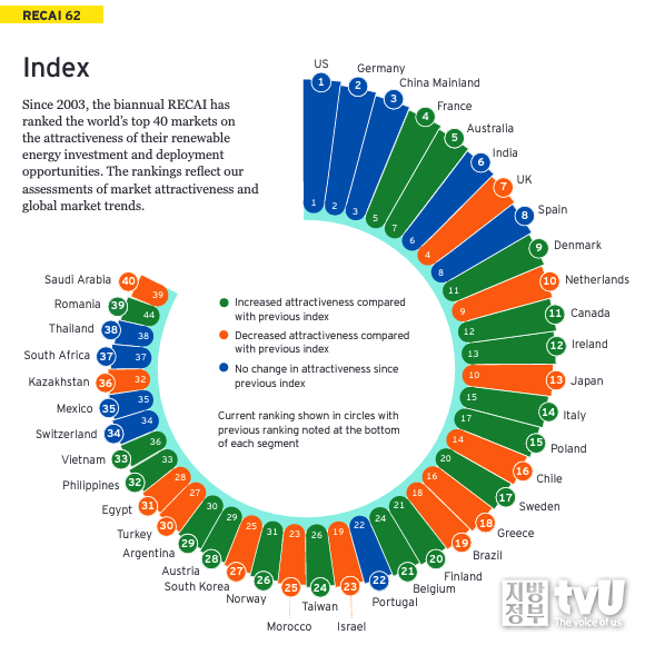 위 그래프는 RECAI (Renewable Energy Country Attractiveness Index), 즉 재생 에너지 국가 매력도 지수를 나타내는데 이 지수는 재생 에너지 투자와 배치 기회의 매력도를 기준으로 세계 상위 40개 시장을 순위로 매긴다. 위 그림에서 확인할 수 있듯이 한국은 27순위로 주황색을 띄고 있는데 이는 재생 에너지 매력도가 전에 비해 감소했다는 것을 의미한다. |