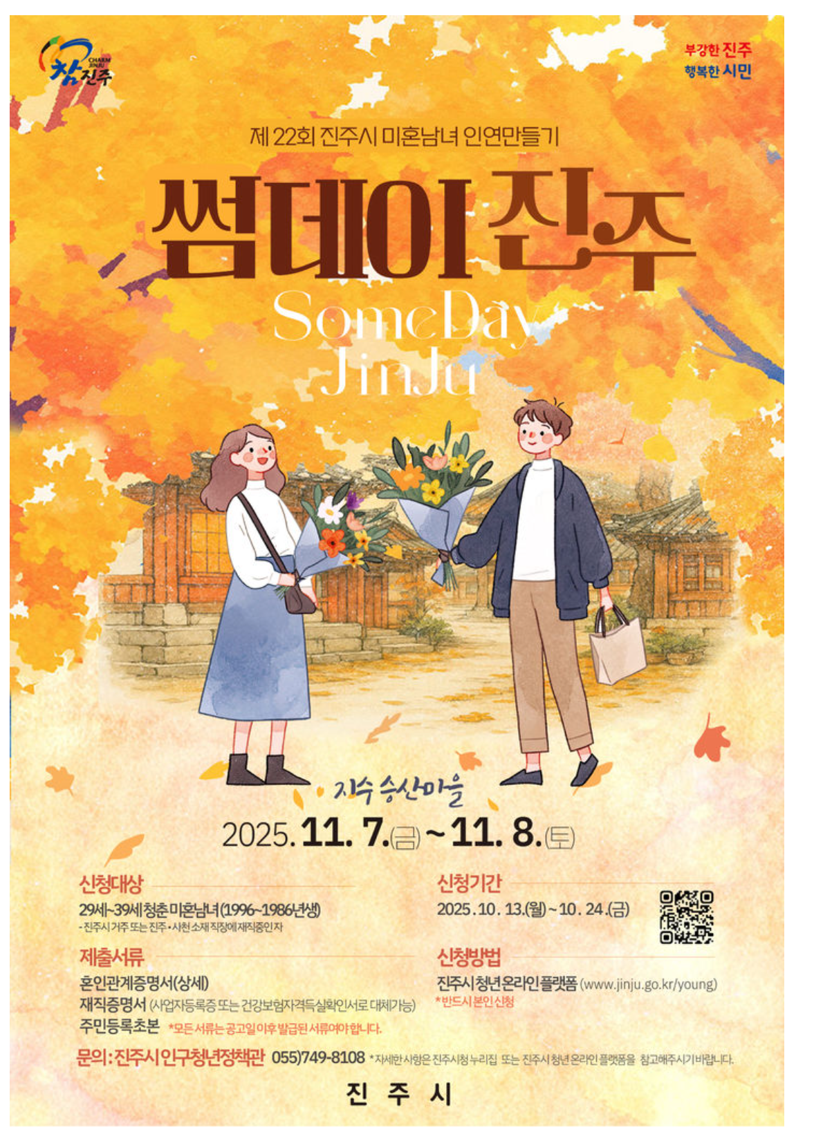 신청 대상은 진주시에 거주하거나, 진주시 또는 사천시 직장에 재직 중인 1986~1996년생 미혼 남녀이다.
