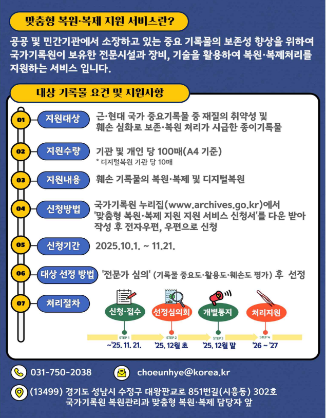 행정안전부 국가기록원(원장 이용철)은 민간 · 공공기관이나 개인이 소장한기록물 중 보존 가치가 높은 기록물에 대해 ‘맞춤형 복원 · 복제 지원서비스’를 2년간(2026년~2027년) 무상으로 추진한다고 밝혔다.