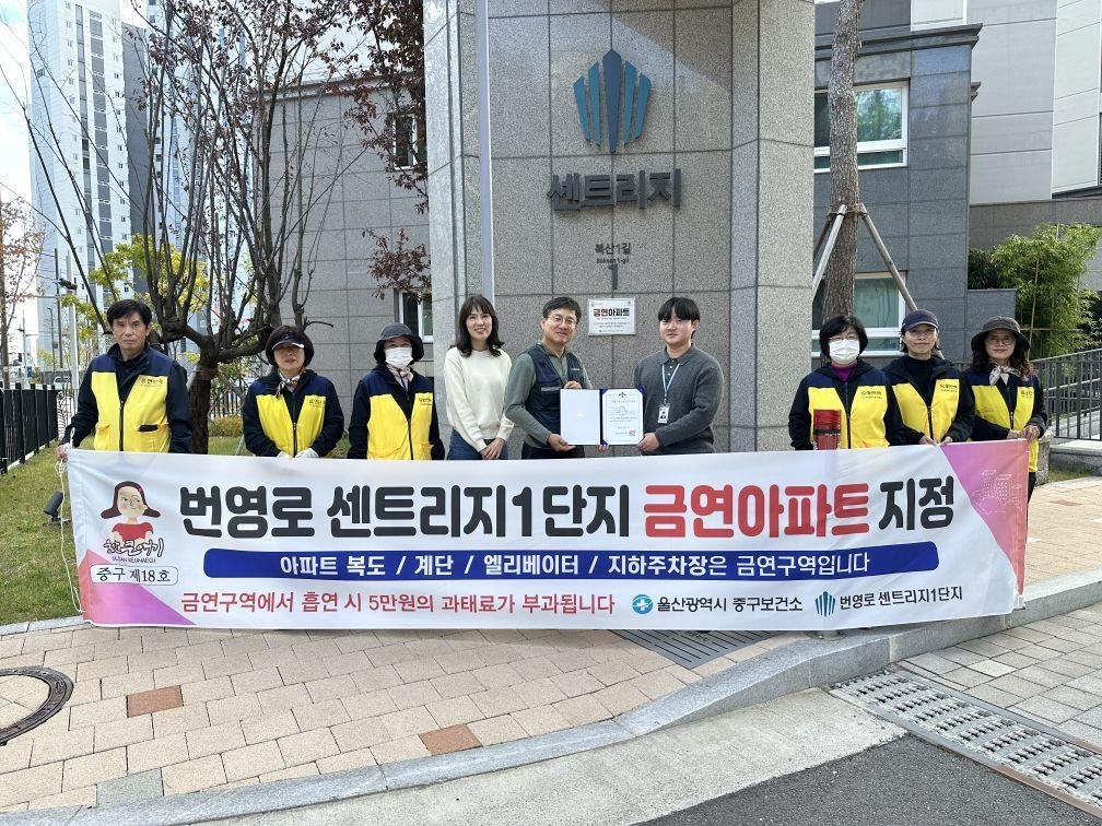 울산 중구보건소(소장 이현주)가 10월 31일 ‘번영로센트리지 1단지’ 아파트를 제18호 금연아파트로 지정했다. 중구보건소는 아파트 주출입구에 금연아파트 현판, 각 동 입구에 금연구역 안내표지판을 설치하고 입주민들을 대상으로 금연 홍보 활동(캠페인)을 펼쳤다.
