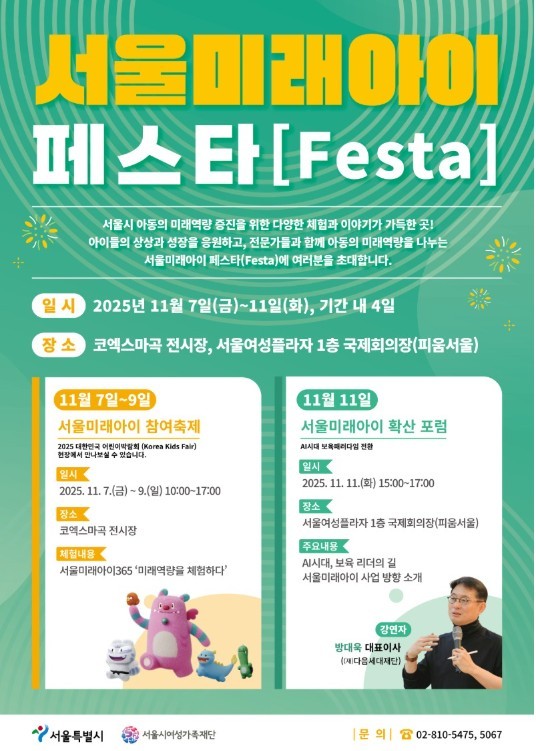 또한, 재단은 11월 7일(금)~9일(일) 코엑스마곡에서 열리는 ‘2025 대한민국 어린이박람회(Korea Kids Fair)’에 참가해 ‘서울미래아이’ 체험부스를 운영한다.