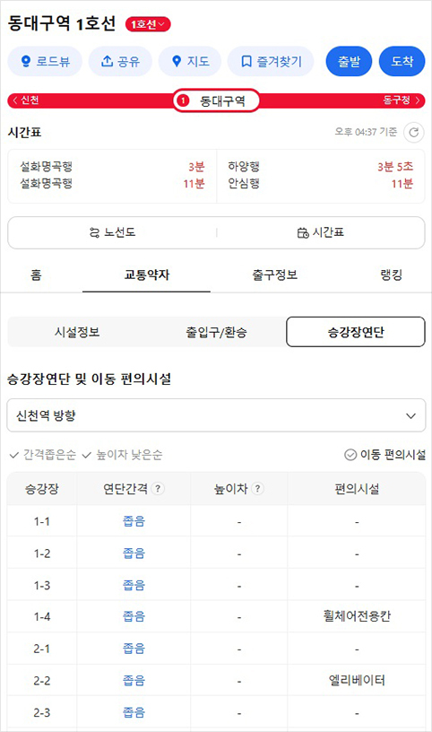카카오맵에서 도시철도 역사를 선택한 뒤 ‘교통약자’ 항목을 누르면 편의시설 정보를 간편하게 볼 수 있다. 이는 교통약자뿐 아니라 일반 이용객에게도 유용한 생활밀착형 공공데이터 서비스로 평가된다.