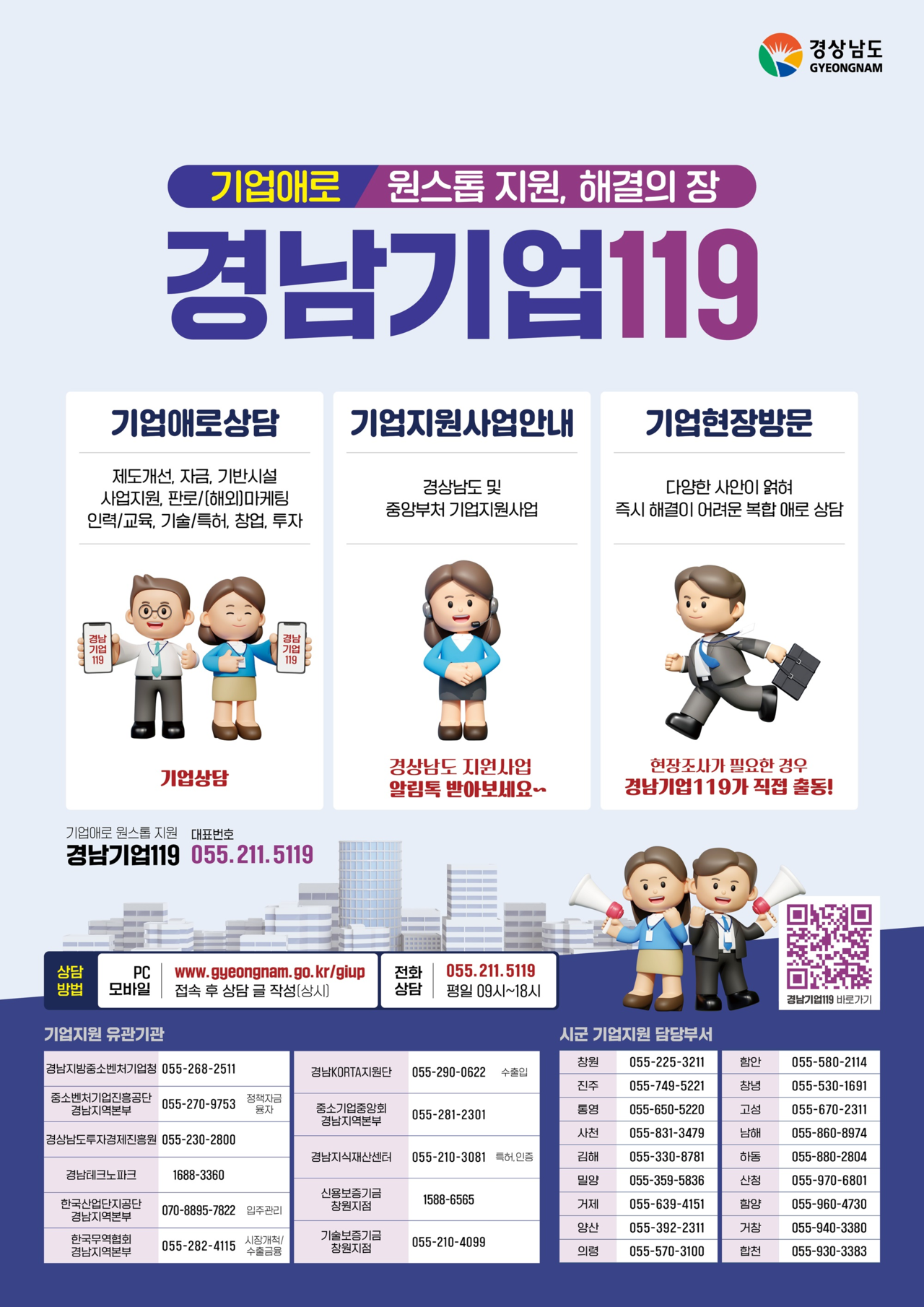 우명희 도 경제기업과장은 “기업에서 필요한 지원사업을 놓치지 않고 적기에 받을 수 있도록 알림서비스를 제공하는 만큼, 도내 기업에서는 경남기업119 알림톡을 신청해 주시길 바란다”며 “내년에도 많은