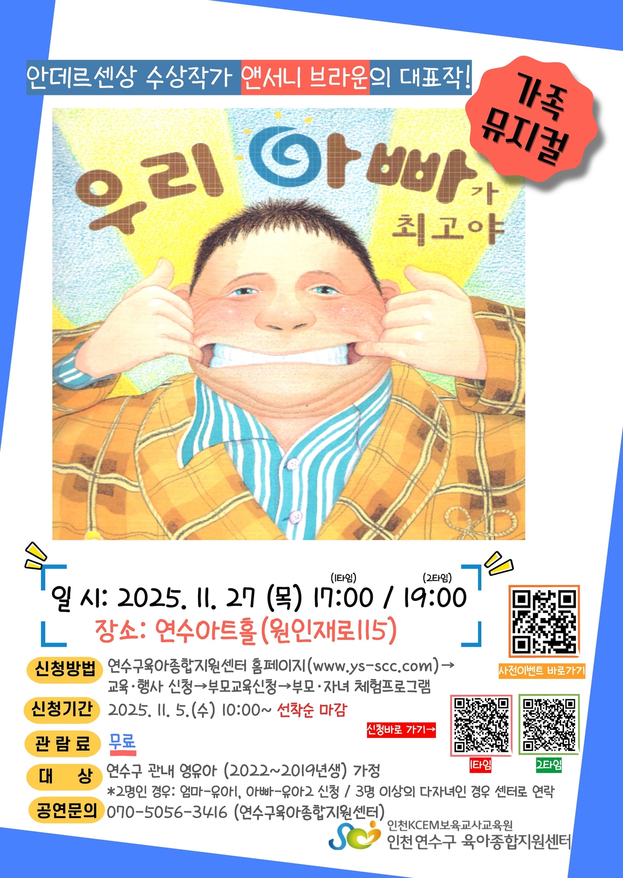 공연 관람 신청은 연수구육아종합지원센터 누리집(www.ys-scc.com)을 통해 가능하며, 자세한 사항은 센터 가정육아지원팀(☎070-5056-3416)으로 문의하면 된다.