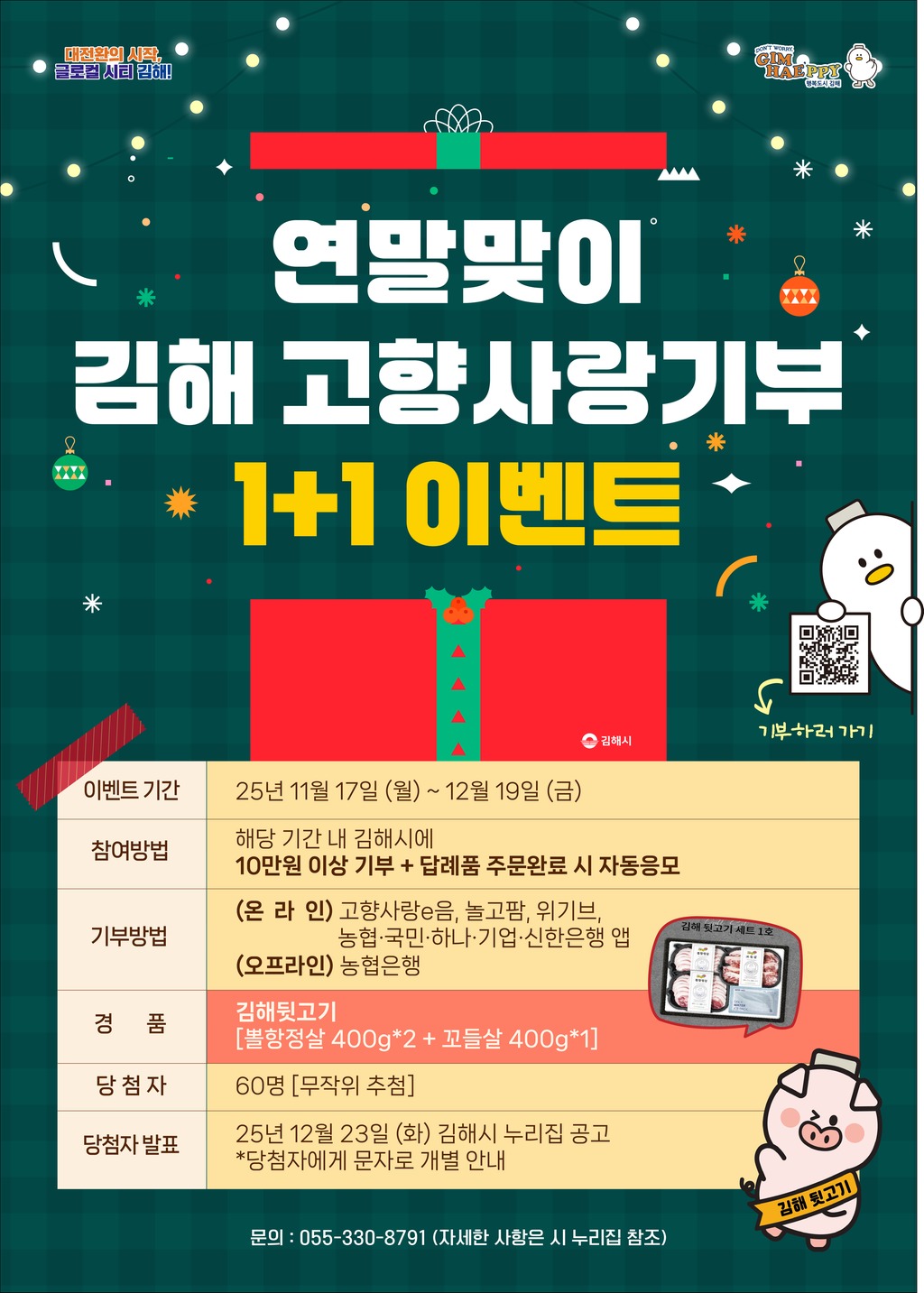 이번 이벤트는 기부자에게 감사의 마음을 전하기 위해 진행되어 해당 기간 중 김해시에 10만원 이상을 기부 후 답례품 신청 시 자동으로 참여되며, 무작위 추첨을 통해 총 60명을 선정해 김해뒷고기(뽈항정살 400g*2 + 꼬들살 400g*1)를 증정한다.