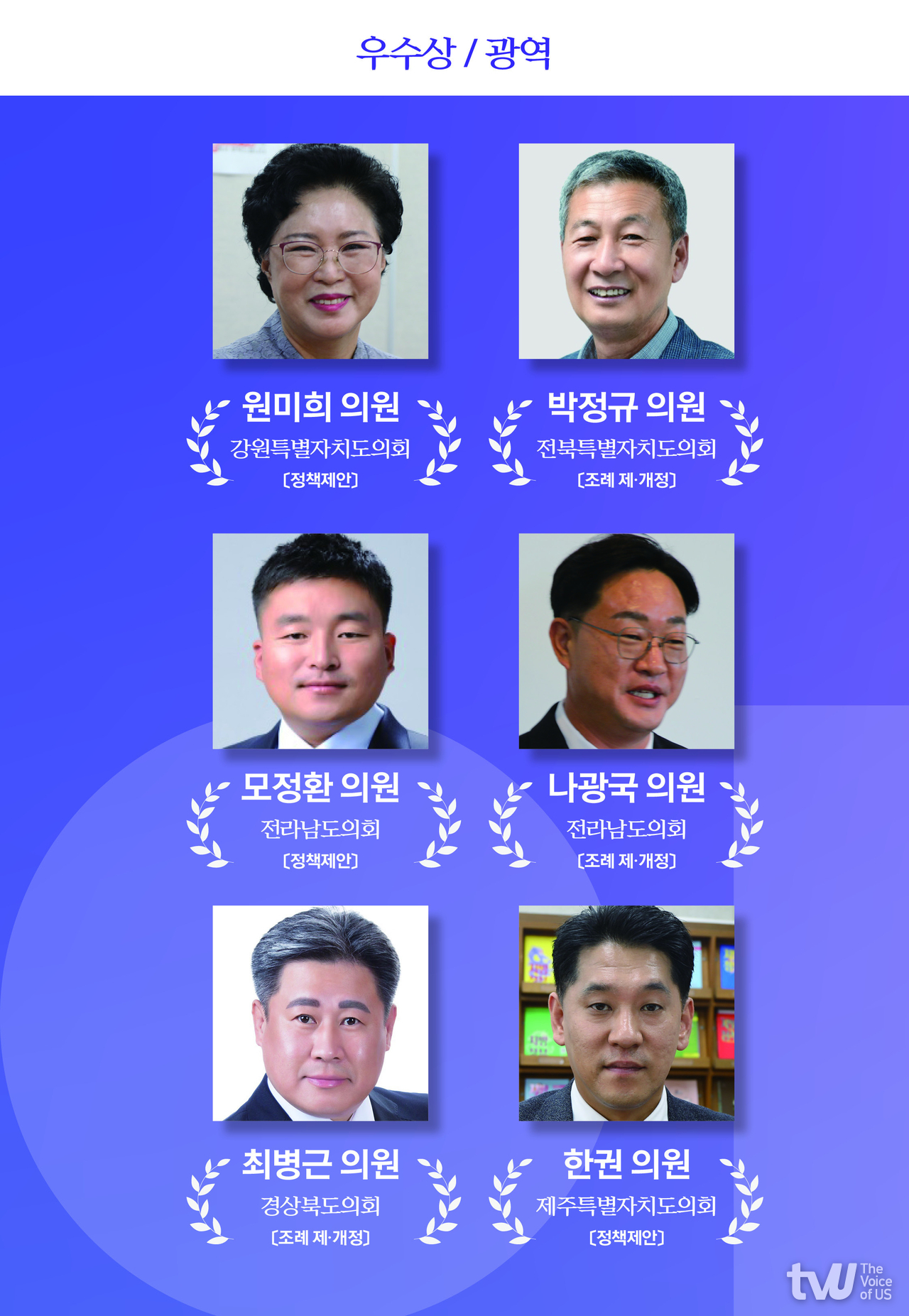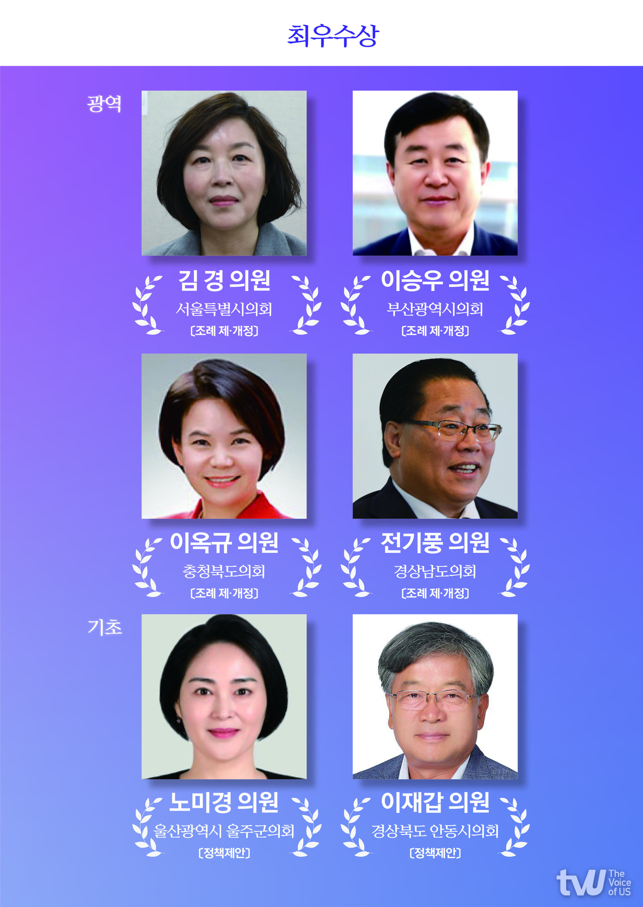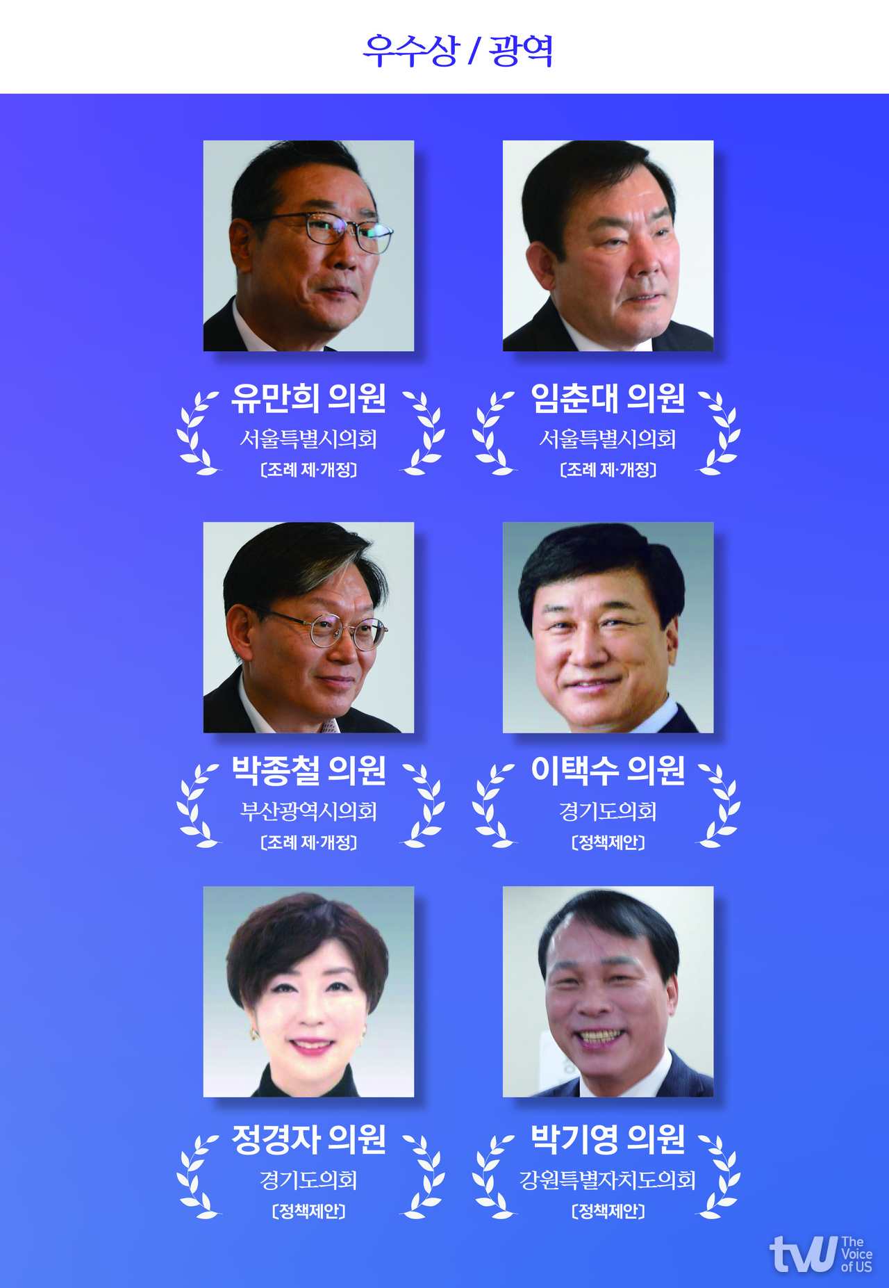 조례 제·개정, 정책 제안, 주민 참여 등 3개 분야에 응모한 기초·광역 의원들을 대상으로 전직 고위 공무원, 교수 등 각계의 전문가 20여 명으로 구성된 심사위원회의 엄정한 심사 끝에 대상 2명, 최우수상 6명, 우수상 33명, 총 41명의 수상자가 선정되었다.