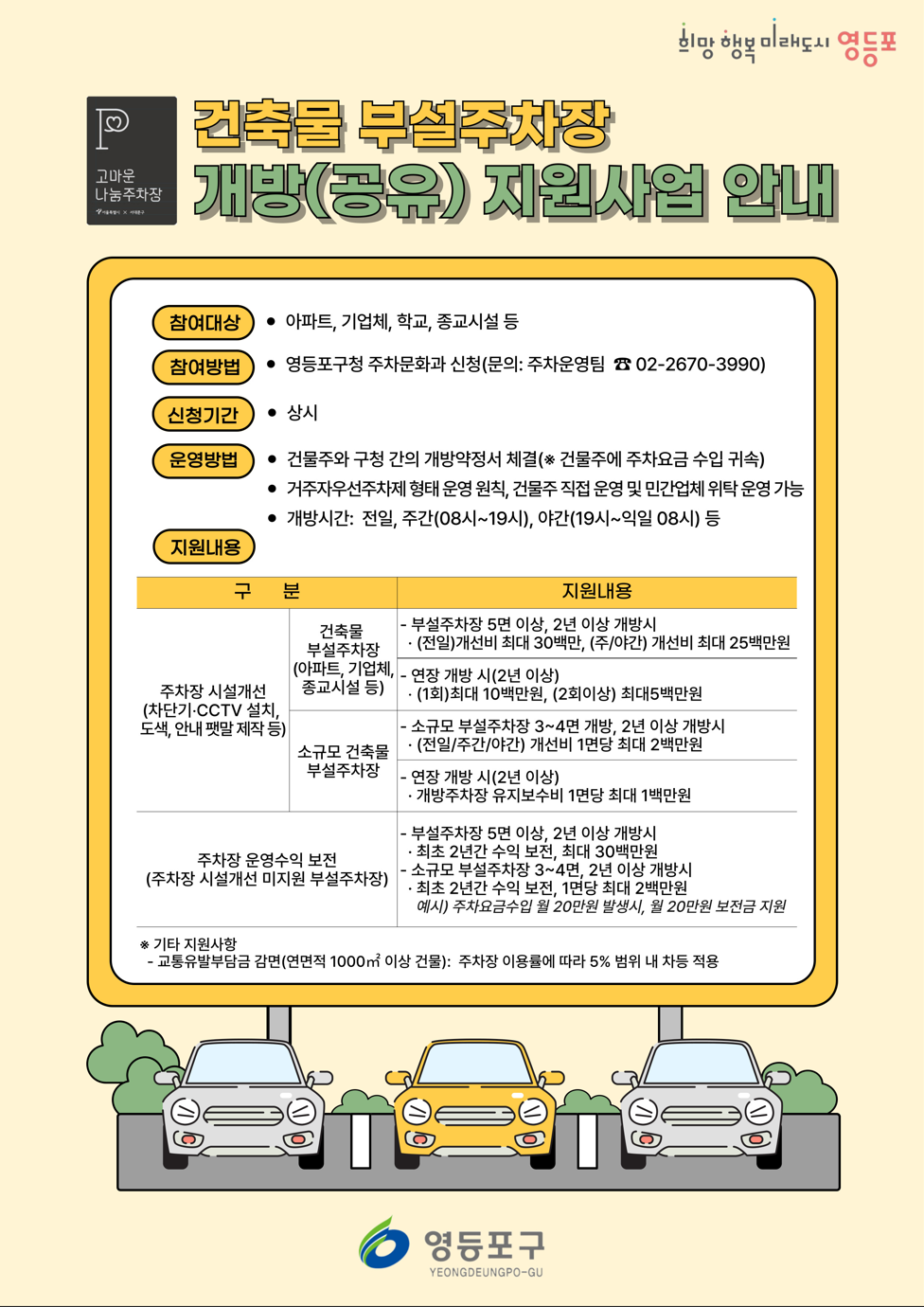 영등포구가 주차난 해소와 공유 문화 확산을 위해 ‘부설주차장 개방 지원사업’에 참여할 건물주를 상시 모집한다고 밝혔다.