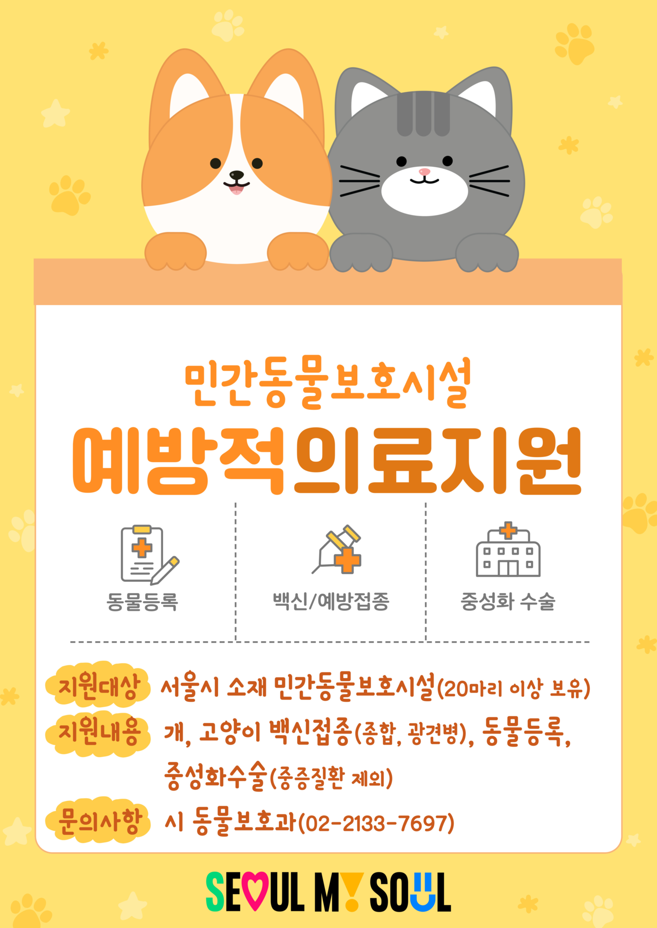 동물의료지원을 원하는 민간동물보호시설은 민간단체 등록이나 비영리 법인 등록 여부와 관계없이, 서울시 소재 동물을 보호하는 시설이면 어디나 가능하며 서울시 동물보호과(02-2133-7697)로 의료지원을 요청하면 된다. 본 사업은 2026년에도 지속적으로 운영할 예정이다.