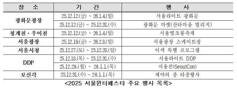<2025 서울윈터페스타>는 서울 주요 도심 광화문광장~청계천~서울광장~DDP~보신각~우이천 6곳을 하나로 잇는 초대형 겨울축제로, 올해는 공연(Play), 체험(Together), K-컬처가 어우러진 이색프로그램을 대거 운영해 전 세계인이 공감하고 참여할 수 있는 글로벌 축제로 거듭난다.