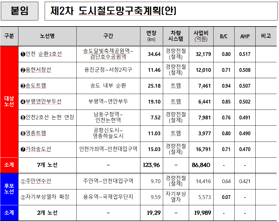 ‘제2차 인천 도시철도망 구축계획’은 ▲인천 순환3호선 ▲용현서창선 ▲송도트램 ▲부평연안부두선 ▲인천2호선 논현 연장 ▲영종트램 ▲가좌송도선 등 총 7개 노선, 총 123.96㎞ 규모의 도시철도 사업이 포함돼 있다.
