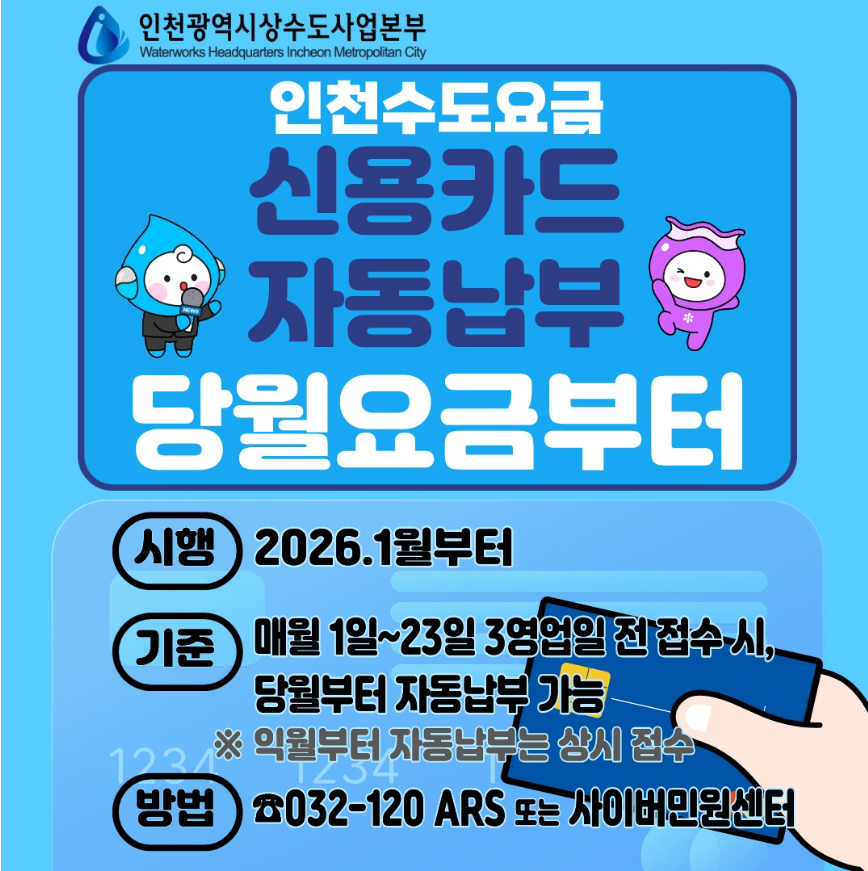 개정된 지침에 따르면 2026년 1월부터는‘매월 1일에서 23일(납부기준일) 3영업일 전까지’전화(☏032-120, 미추홀콜센터) 또는 누리집(인천상수도 사이버민원센터)을 통해 신용카드 자동납부를 신청하면 해당 월에 청구된 수도 요금부터 자동납부가 진행된다.