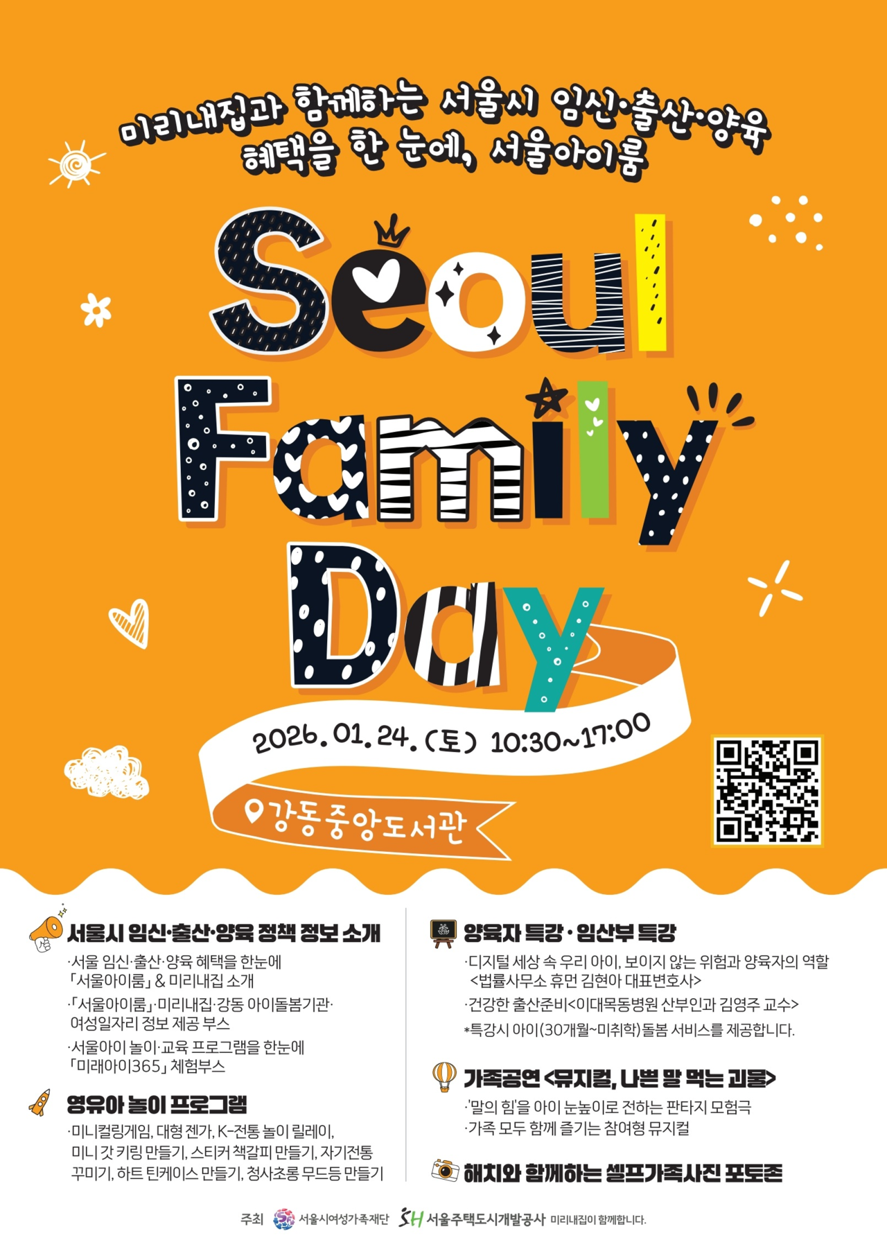 서울시여성가족재단은 임신·출산·양육 지원을 잇는 온·오프라인 서비스 ‘서울아이(i)룸’의 2월 오픈을 앞두고, 보다 많은 시민에게 알리고 실제 생활 속 활용도를 높이기 위해 시민 체험형 소통 행사 ‘서울패밀리데이’를 1월 24일(토)에 개최한다.